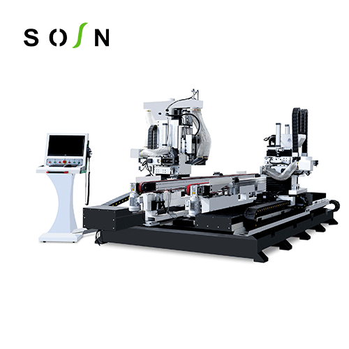 功能:門扇鎖、合頁等五金件安裝孔、槽的加工。特點(diǎn):自動(dòng)對刀功能,保證換刀,斷刀更換時(shí)的加工精度。 主軸正反旋設(shè)計(jì)銑削,確保加工不崩邊,崩角,提高加工質(zhì)量。 門扇鎖孔,合頁兩側(cè)同時(shí)加工,提高生產(chǎn)加工的效率。 真空吸附平臺(tái),自動(dòng)測寬,測厚功能,滿足不同寬度,厚度門扇的精確
