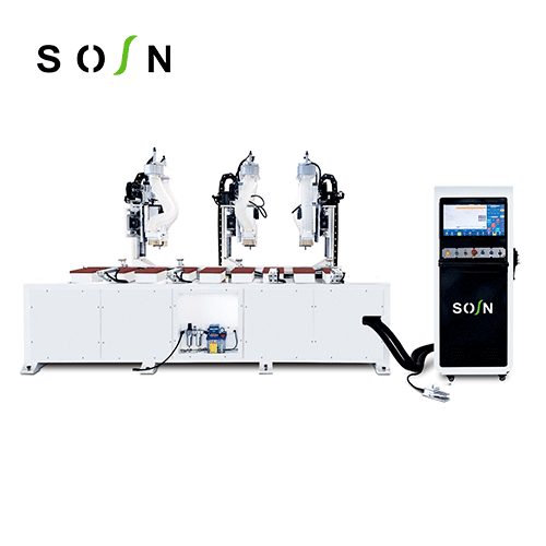 功能: 門套鎖舌,合頁(yè)安裝孔、槽的加工。特點(diǎn):自動(dòng)對(duì)刀功能,保證換刀,斷刀更換時(shí)的加工精度。 主軸正反旋設(shè)計(jì)銑削,確保加工不崩邊,崩角,提高加工質(zhì)量。 門套鎖舌,合頁(yè)功能,門套寬度方向夾緊靠料功能,確保門套長(zhǎng)度方向上的彎曲。 氣動(dòng)夾具夾緊,可根據(jù)加工長(zhǎng)度靈活調(diào)整,滿足不同長(zhǎng)度門套